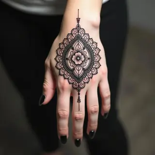 This striking tattoo features a complex geometric mandala design that wraps around the entire upper arm. The artist utilizes dotwork and linework techniques to create an intricate pattern of interlocking shapes and lines.