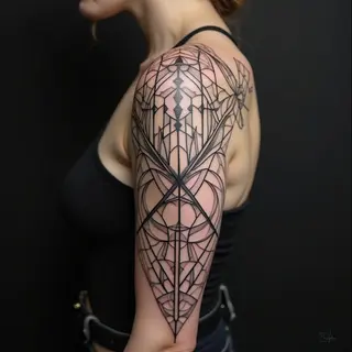 This captivating geometric sleeve tattoo demonstrates the power of precision and symmetry in body art. The design utilizes a combination of hexagonal and other polygonal shapes to create a visually dynamic and mesmerizing effect that flows seamlessly across the upper arm.