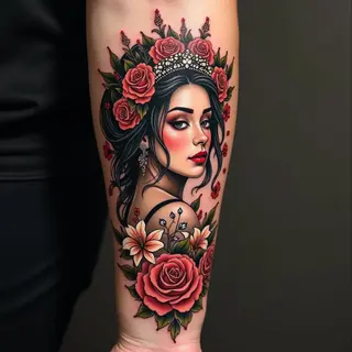 This striking tattoo showcases the Flower of Life, a sacred geometric pattern found across cultures and time. The design is rendered with vibrant colors and precise linework, creating a visually captivating piece on the thigh. It represents creation, harmony, and interconnectedness.