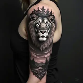 This captivating tattoo showcases a powerful lion, rendered in meticulous detail and shaded with black and grey inks. The addition of a crown symbolizes authority and nobility, while the integrated clock face adds a layer of symbolism representing the fleeting nature of time. The design is well-balanced and visually striking, making it an excellent choice for those seeking a bold and meaningful piece.