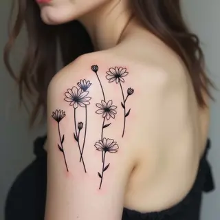 This half-sleeve tattoo showcases a collection of stylized flowers and foliage rendered in fine line work. The illustrative approach emphasizes delicate details and creates a sense of ethereal beauty. The design is well-balanced, flowing naturally with the contours of the arm. This style lends itself to both subtle elegance and impactful visual presence.