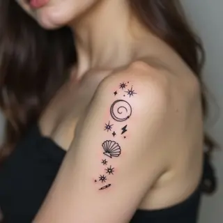 This tattoo exemplifies the power of minimalism in body art. The arrangement of small circular symbols along the finger creates a visually striking yet understated statement. Fine line techniques are employed to achieve precision and elegance, emphasizing the symbolic nature of the design.