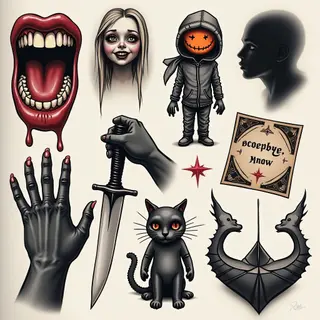 This flash sheet presents a striking design centered around three heart shapes, each containing stylized depictions of recognizable horror characters. The hearts are visually divided by vertical cracks, creating a fragmented and unsettling aesthetic. The style draws heavily from classic Halloween imagery with a dark twist. This concept lends itself well to cover-ups or redemption pieces, symbolizing brokenness and potential for healing through transformation.