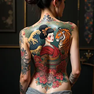 This striking tattoo showcases a full back piece in the traditional Japanese Irezumi style. The artwork incorporates elements of classical Japanese art, including figures, floral motifs, and dynamic wave patterns. The technique emphasizes bold outlines, smooth shading, and vibrant color palettes characteristic of this ancient art form. It's a testament to the skill and dedication required for such an extensive and meaningful piece.