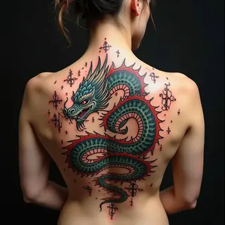 This tattoo exemplifies the classic irezumi style, a deeply rooted tradition in Japanese tattooing. The prominent dragon symbolizes strength, wisdom, and good fortune, while the koi fish represent perseverance, courage, and transformation.