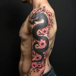 This tattoo showcases a traditional Japanese warrior figure rendered in the irezumi style. The composition is dynamic, with the warrior depicted wielding a weapon amidst swirling floral motifs. The use of bold outlines, shading, and color creates depth and visual impact. This design exemplifies the rich symbolism and artistic skill inherent in Japanese tattooing traditions.