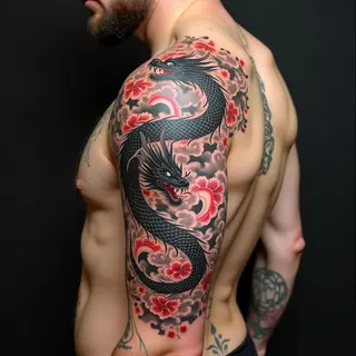 This impressive full sleeve tattoo embodies the spirit of traditional Japanese Irezumi. The central motif is a vibrant school of koi fish, symbolizing perseverance and strength as they navigate stylized waves representing life's challenges.