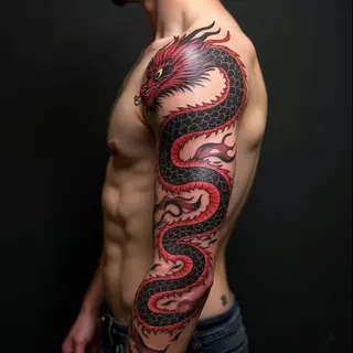 This captivating tattoo exemplifies the beauty and complexity of traditional Japanese tattooing (irezumi). The design features a prominent dragon, symbolizing strength and good fortune, gracefully intertwined with vibrant koi fish representing perseverance and transformation. The crashing waves add dynamism and depth to the composition, reflecting the power of nature.