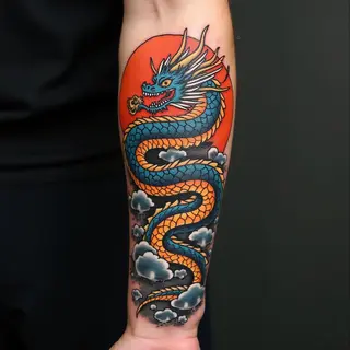 This impressive full sleeve tattoo exemplifies the rich tradition of Japanese Irezumi. The central figure is a samurai warrior in dynamic action, surrounded by swirling clouds, cherry blossoms, and other symbolic elements characteristic of traditional Japanese art. The use of bold outlines, vibrant colors, and meticulous shading creates a visually striking and deeply meaningful piece.