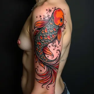 This striking tattoo showcases a classic Japanese Irezumi style composition. The central motif is a vibrant koi fish swimming amidst stylized cherry blossoms and swirling water patterns. The artist employs traditional shading techniques to create depth and movement, emphasizing the strength and resilience symbolized by the koi. The delicate cherry blossoms add an element of beauty and transience, common themes in Japanese art. This design exemplifies the meticulous detail and symbolic richness characteristic of Irezumi.