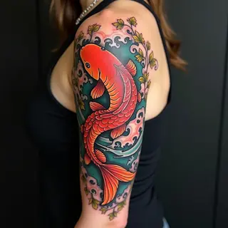 This vibrant design showcases a classic combination of Japanese motifs. A koi fish symbolizes perseverance and strength, while an Oni (demon) represents protection and warding off evil. The traditional style incorporates bold outlines, dynamic movement, and symbolic imagery characteristic of Irezumi.