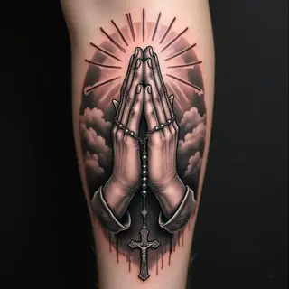 This captivating tattoo depicts hands clasped in prayer, adorned with a crown of thorns. The design utilizes meticulous blackwork shading to create depth and realism, conveying a powerful message of devotion and resilience.