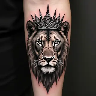 This captivating tattoo depicts a powerful lion gazing intently forward, complemented by a vibrant red rose emerging from below. The realism is achieved through meticulous shading and attention to detail, creating depth and dimension. The combination of the lion's strength and the rose’s beauty symbolizes resilience, courage, and enduring love.