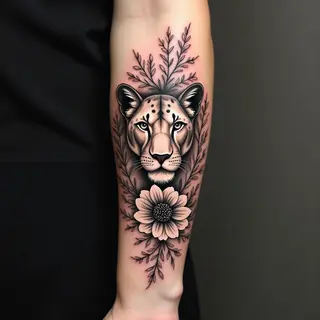This captivating tattoo depicts the powerful visage of a lion, skillfully rendered in a realistic style. The use of black and grey shading creates depth and dimension, highlighting the animal's intense gaze and intricate fur texture. Partially concealed by leaves, the portrait evokes a sense of mystery and wildness. The composition is dynamic, drawing the eye to the lion’s piercing eyes while maintaining an overall balance with the surrounding foliage. This design exemplifies the artistry of realistic tattoo techniques.