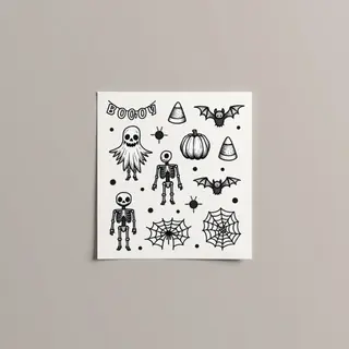 This collection showcases a series of small, illustrative tattoos with a distinctly spooky yet whimsical theme. Each design is rendered in a traditional style, utilizing bold outlines and shading to create depth and character. The subject matter ranges from classic Halloween imagery like pumpkins and black cats to more unusual combinations such as a snail carrying a skull.