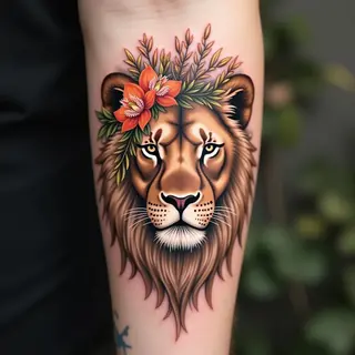 This tattoo showcases a lion's head meticulously integrated within a geometric mandala structure. The lion, a symbol of strength, courage, and royalty, is depicted with sharp angles and precise lines, creating a visually dynamic composition.