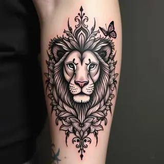This captivating tattoo seamlessly integrates the majestic imagery of a lion with the intricate patterns of a mandala. The lion, often symbolizing courage, strength, and leadership, is meticulously crafted within the circular framework of the mandala, representing wholeness, harmony, and spiritual journey.