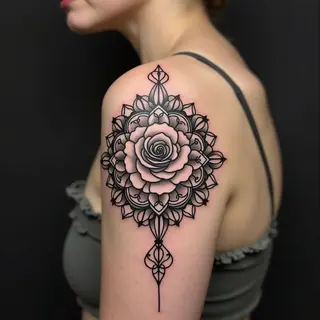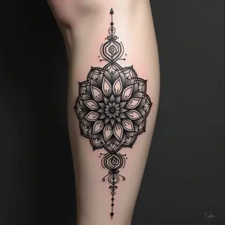 This striking tattoo showcases a beautiful blend of two powerful symbols: the lotus flower, representing purity and enlightenment, and the mandala, symbolizing wholeness and balance. The artist has skillfully combined these elements using precise blackwork techniques to create a visually captivating piece.