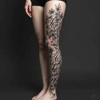 This striking tattoo showcases a realistic depiction of a lion’s head seamlessly integrated with detailed foliage. The placement on the thigh allows for a dynamic composition that wraps around the musculature.