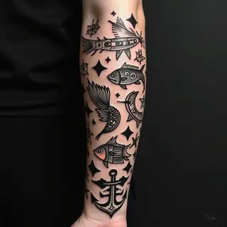 The design demonstrates the enduring appeal of vintage tattooing, characterized by its clean lines, limited color range, and symbolic imagery. Careful attention to detail in shading and line work creates depth and visual interest.