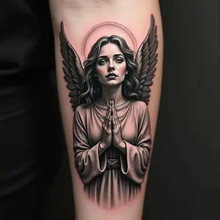This tattoo combines the powerful imagery of praying hands with the sacred symbolism of a rosary. The design often represents faith, devotion, and seeking divine guidance. The placement on the forearm allows for clear visibility and serves as a constant reminder of one's beliefs. The blackwork style lends a timeless quality to this deeply personal piece. Variations may include subtle shading or more detailed rendering of the hands and beads.