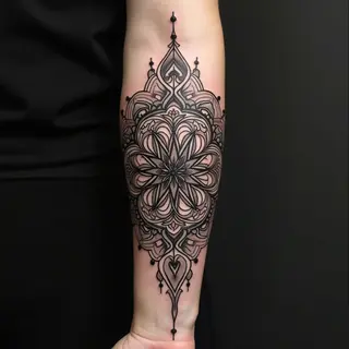 Black ink and precise linework highlight the complexity of the design, evoking a sense of balance and harmony. This style often appeals to those seeking spiritual or philosophical meaning in their body art.