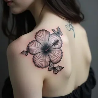 This striking tattoo features a cluster of hibiscus flowers gracefully arranged on the wearer's shoulder blade. The design utilizes blackwork shading techniques to create depth and dimension within the petals and leaves. The placement emphasizes the natural curve of the shoulder, creating a visually appealing composition.
