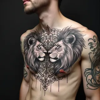 This captivating tattoo showcases a powerful lion seamlessly integrated within an intricate geometric mandala. The design combines the strength and majesty of the lion with the spiritual symbolism of the mandala, creating a visually stunning piece.