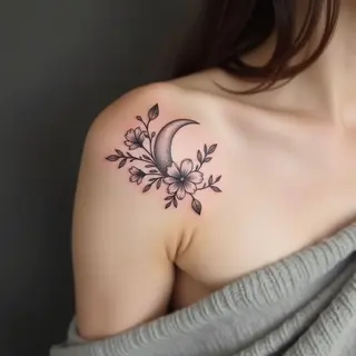 This tattoo showcases a simple geometric pattern placed on the upper shoulder. The design utilizes fine black linework to create a symmetrical, star-like motif. Its small size and minimalist style make it suitable for first-time tattoos or those who prefer understated designs.