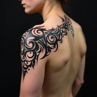 This design showcases a combination of symbolic imagery: a shield representing defense, a sword symbolizing strength and courage, and a laurel wreath signifying victory and honor. The placement on the shoulder allows for visibility while maintaining a balanced aesthetic. The style leans towards illustrative with clean linework and moderate detail.