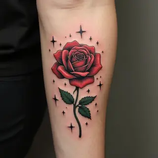 This impressive sleeve tattoo showcases a masterful blend of realism and ornamental artistry. The design centers around realistically rendered roses interspersed with stars and complemented by elegant script lettering. The shading is smooth and detailed, creating depth and dimension within the floral elements. The script adds a personal touch while maintaining the overall aesthetic harmony. This style is popular for its ability to combine beauty and personalization.