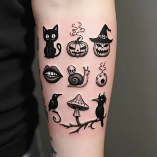 The bold lines and limited color palette are characteristic of classic tattoo art, evoking a nostalgic and slightly eerie atmosphere. These designs are ideal for those seeking a vintage-inspired Halloween tattoo.