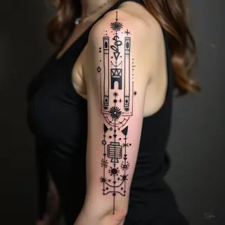 This striking forearm tattoo exemplifies traditional tribal art, likely drawing inspiration from Polynesian or similar cultural styles. The design features a complex arrangement of geometric shapes, lines, and patterns that flow seamlessly along the arm's contours.