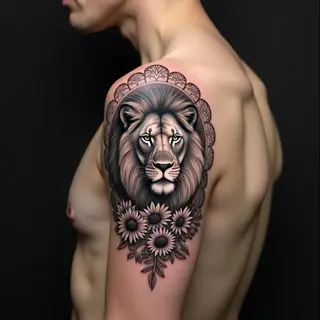 This tattoo showcases a majestic lion seamlessly integrated within a geometric mandala design. The lion, a symbol of courage, strength, and leadership, is framed by the intricate symmetry of the mandala, representing wholeness, balance, and harmony.