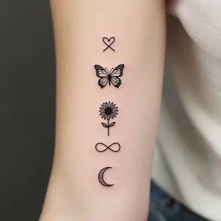 This image showcases a full sleeve tattoo comprised of multiple individual designs in a traditional style. The tattoos feature a variety of motifs including birds, flowers, anchors, playing cards, and geometric patterns.