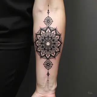 This temporary tattoo features an intricately designed mandala with a strong geometric influence. The design is characterized by precise lines, symmetrical patterns, and a calming visual balance.