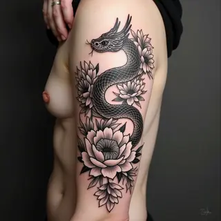 This striking tattoo features an Oni (demon) head rendered in a traditional Japanese style. The Oni is a prominent figure in Japanese folklore, often representing strength, protection, and warding off evil spirits. This particular depiction showcases the characteristic fierce expression and horns of the demon, meticulously executed with bold outlines and shading techniques typical of Irezumi.