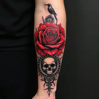 The design incorporates bold outlines, rich colors, and symbolic imagery characteristic of traditional American tattooing. Floral elements cascade across the shoulders and upper arms, creating a cohesive and visually captivating composition.
