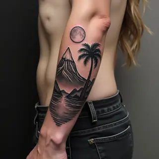 This tattoo showcases a bold blackwork style, combining elements of traditional illustrative art with a modern sensibility. The subject matter – a vintage motorcycle navigating a rugged mountain range – speaks to themes of adventure, resilience, and the pursuit of freedom.