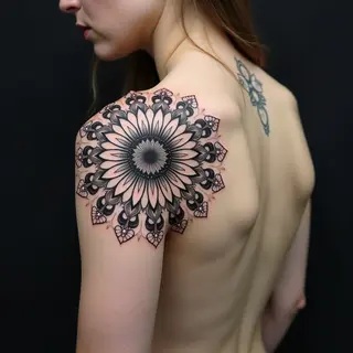 The placement on the shoulder allows for a dynamic composition that flows naturally with the body’s contours.
